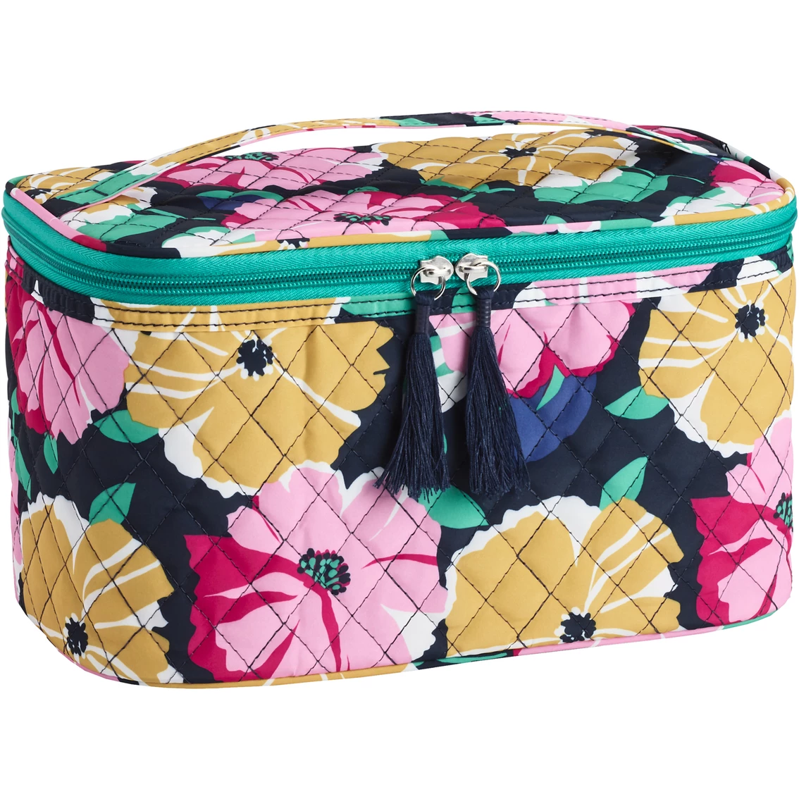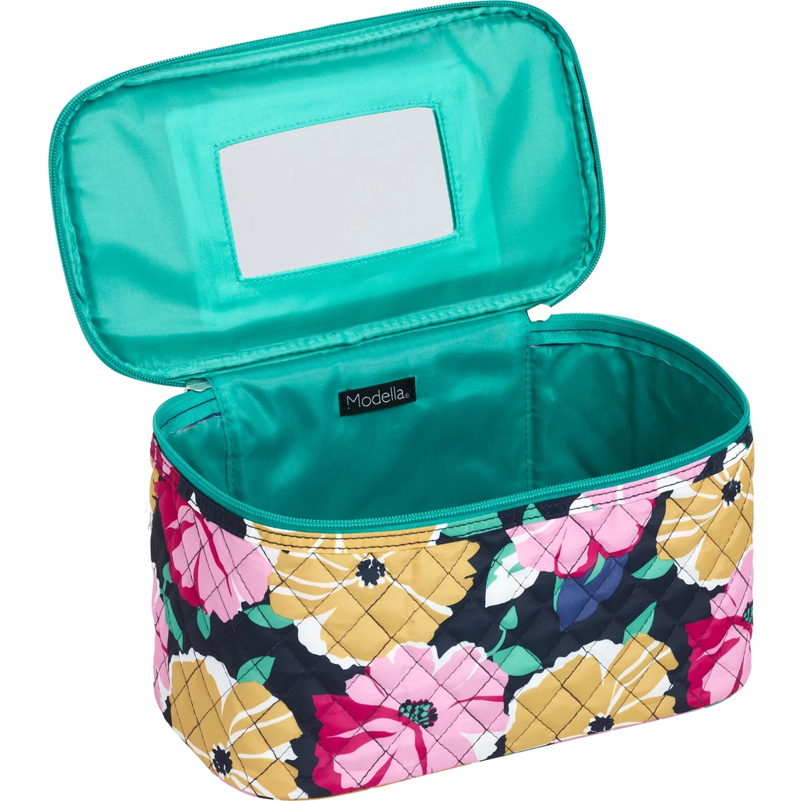 This Allegro Modella Big Bloom Train Case is decorated with a quilted floral design. It has one main zippered compartment and a makeup mirror attached to the lid. It has a single top handle, zipper closure with two decorative tassel zipper pulls. Made of quilted microfiber, this train case comes fully lined. Model: A012649.