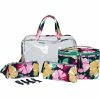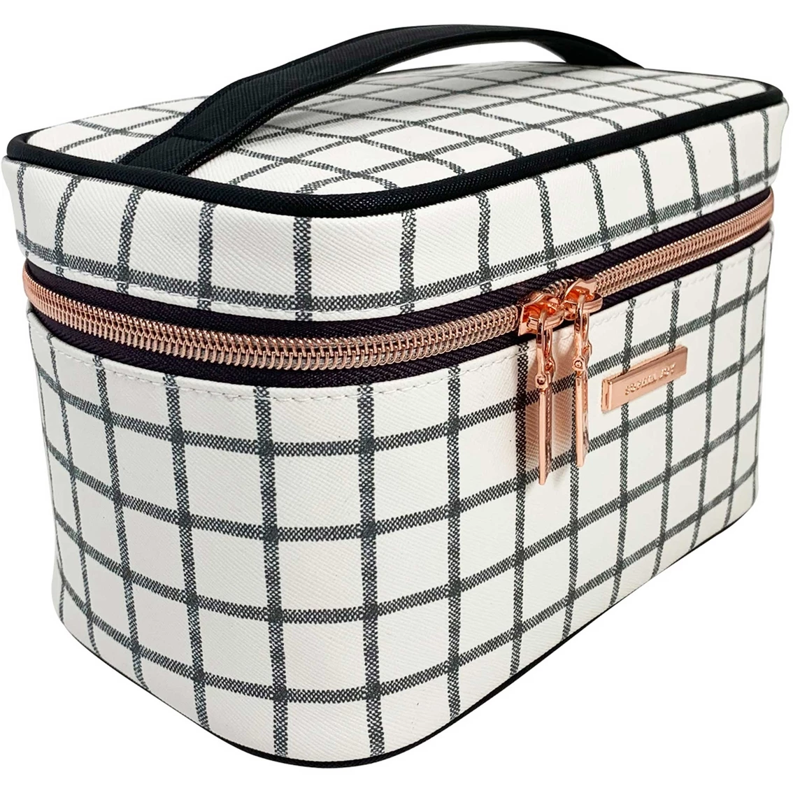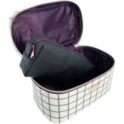 The Allegro Sophia Joy Checked Out 2-Piece Train Set is decorated with a chic check-out design. The set includes one train case and one pencil case. It features a goldtone metal coil zipper and hardware and is fully lined. Each piece in this set is made of PVC. Model: A014837.