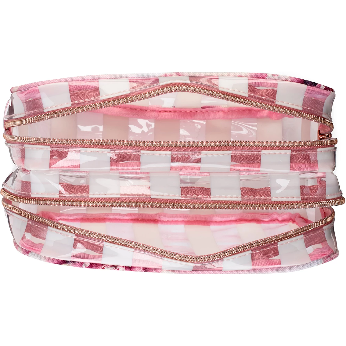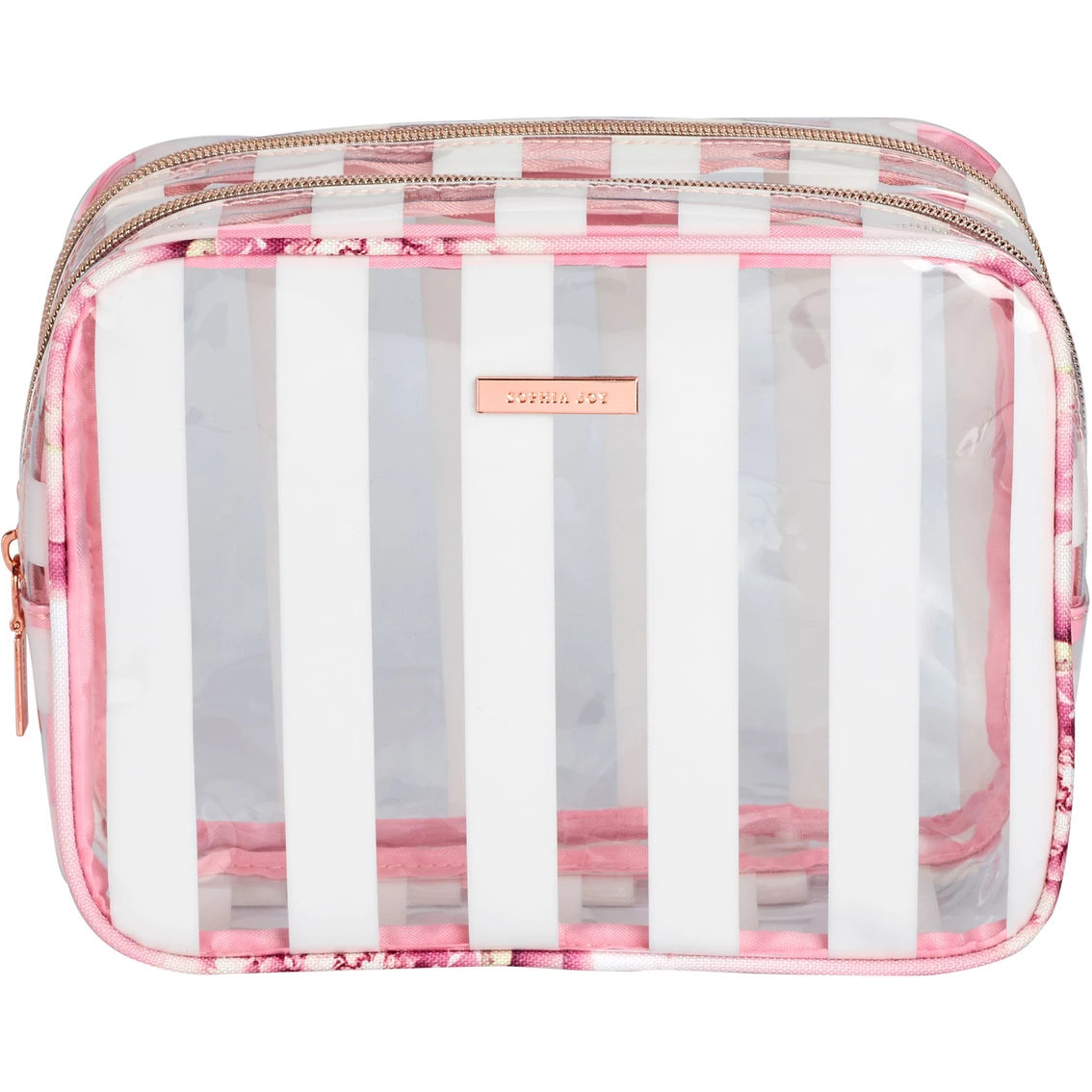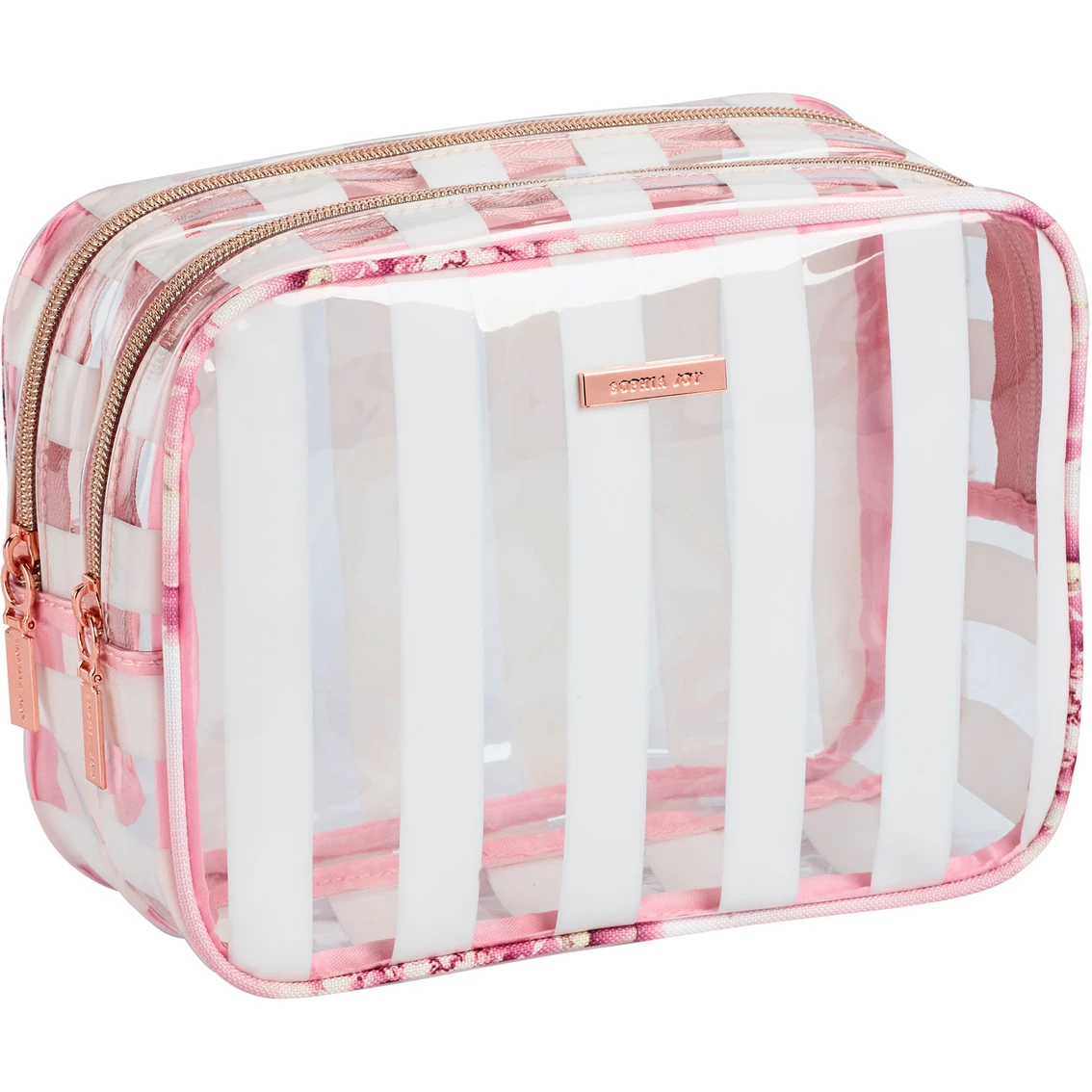 Keep your makeup essentials in place with the Allegro Sophia Joy Floral Double Zip Organizer. This clear cosmetic bag has a striped design and is decorated with elegant floral trimming. This organizer includes two spacious zippered compartments, goldtone metal coil zipper and hardware. It’s made of clear PVC. Style: A013113.