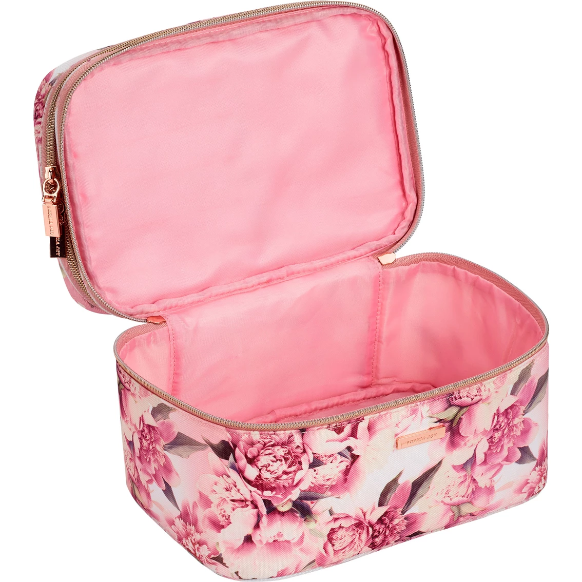 The Allegro Sophia Joy Floral Double Zip Train Case is decorated with elegant pink floral design. Take this Allegro organizer with you or leave it at home. With its spacious compartment, it’s the perfect size to travel with or use as home makeup storage. The top compartment comes with one (1) zip pocket and six (6) brush slots. It also has a spacious lower compartment. Features include goldtone metal coil zipper and hardware. It’s made of polyester and comes fully lined. Model: A013112.
