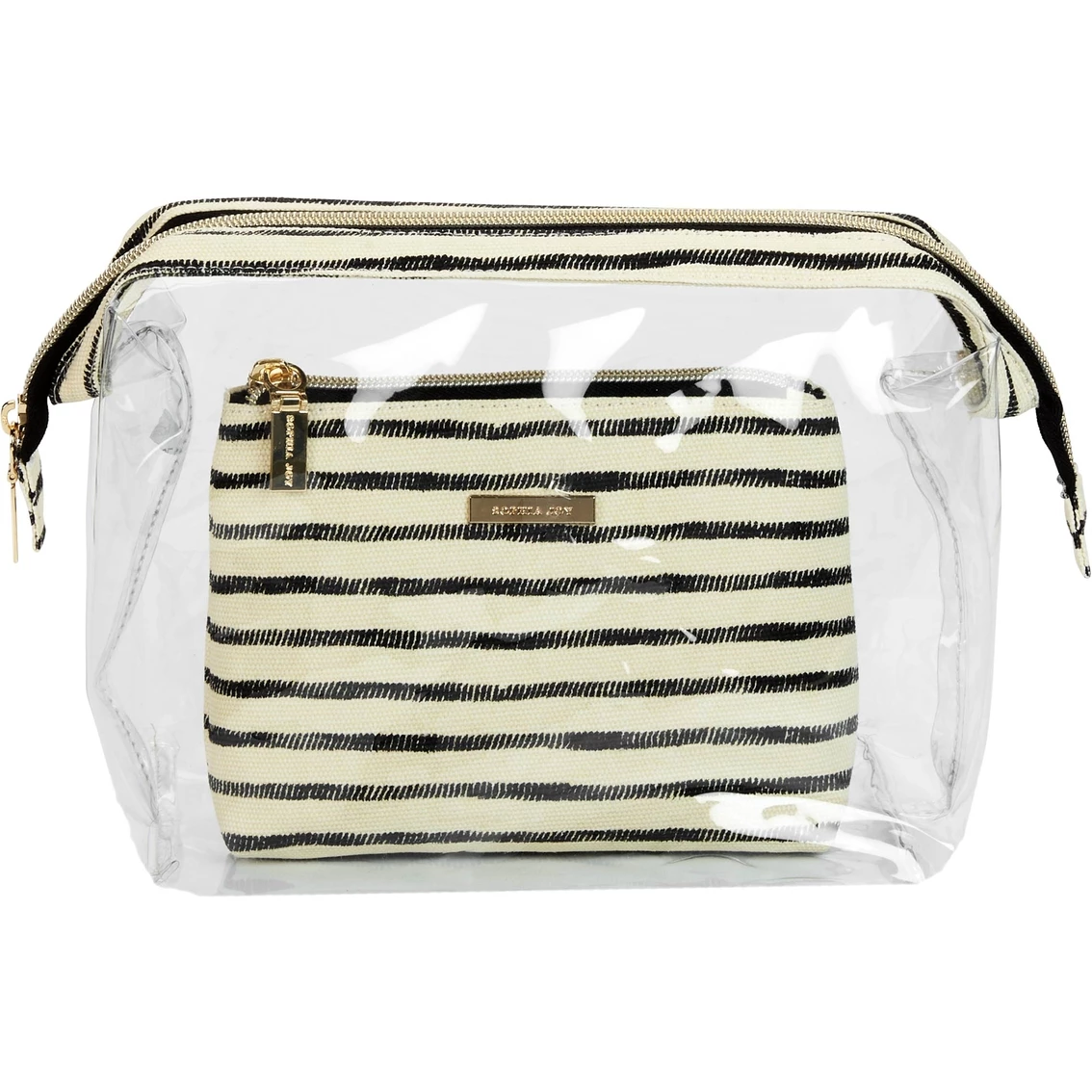 Clear and lightweight, this 2-piece frame clutch set with stripes from Allegro makes a stylish statement. The set includes a large clear framed clutch and a smaller canvas purse kit. The framed opening in the clutch creates a larger main compartment for storing your phone, cosmetics, hand sanitizer, toiletries and more. Fashioned from a durable mix of PVC, cotton and polyester, each bag has a goldtone metal coil zipper and puller that closes securely while adding a touch of bling. This purse kit is fully lined and wipeable for easy cleaning. The large framed clutch is clear, making it easy to see any items you need to grab in a pinch and easy to clean. It’s great for getaways or keeping organized at home. Style: A28518.