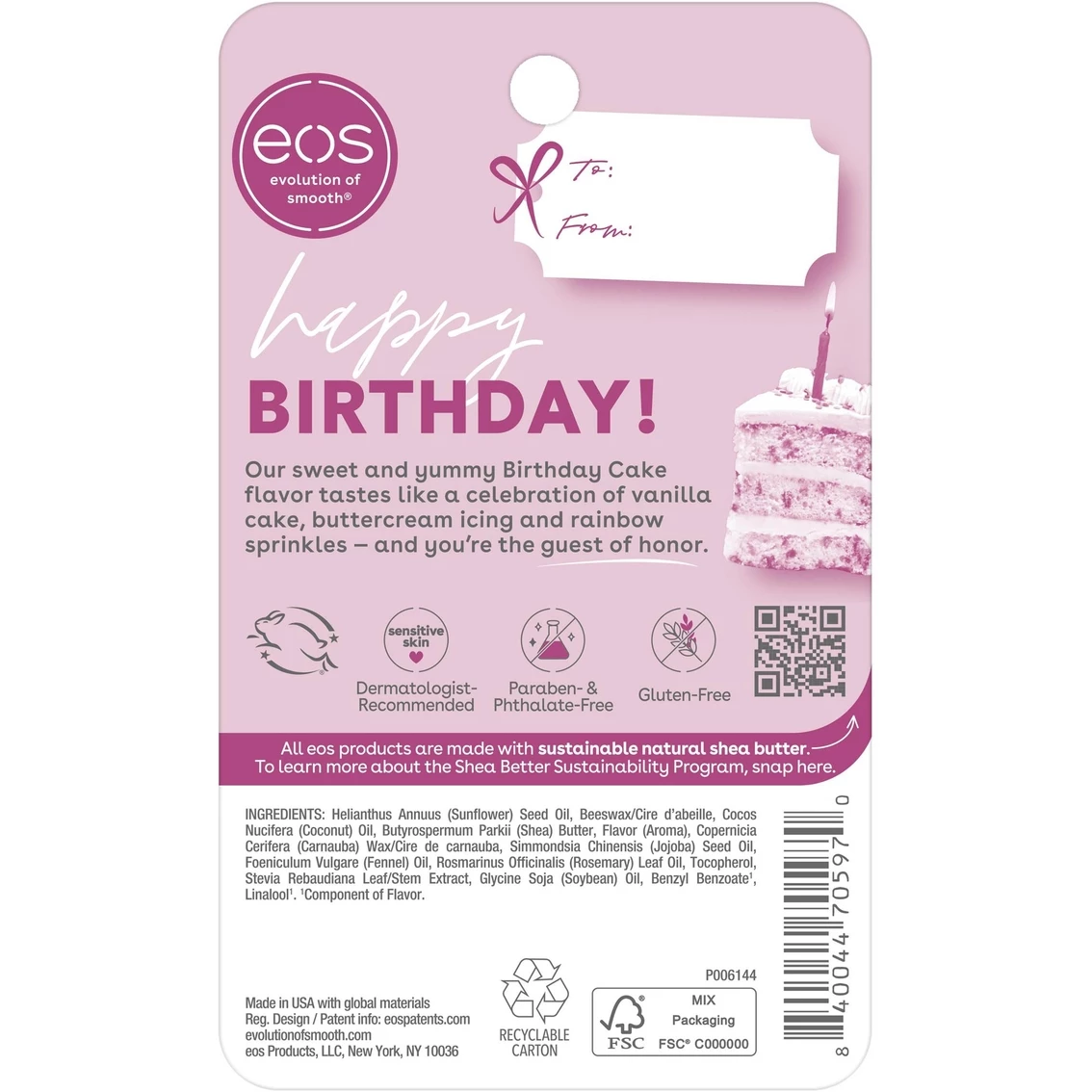 The eos (evolution of smooth) Birthday Cake Lip balm has a sweet and yummy birthday cake flavor. Tastes like a celebration of vanilla cake, buttercream icing and rainbow sprinkles – and you. eos (evolution of smooth) Birthday Cake Lip Balm offers 24 hour moisture and it has been dermatologist tested to be hypo allergenic and paraben-free. This lip balm is cruelty free and gluten free. Enjoy this sweet treat for your lips!