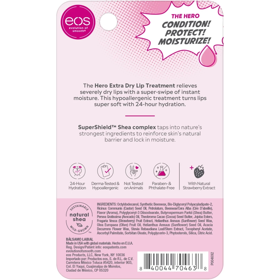 evolution of smooth (eos) Lip Repair conditions + protects severely dry lips. This formula ishypoallergenic (for sensitive skin). Enjoy immediate +24-hour moisture. This formula is made from beeswax and it is vegan with a refreshing berry flavor.